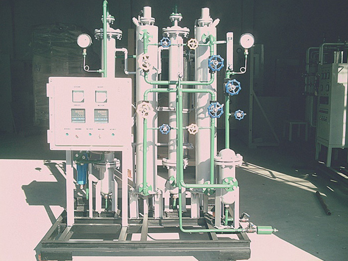 ??以純度大于97%的工業(yè)氫氣為原料氣,采用鈀觸煤為催化劑,通過氧和氫生成水,再通過冷凝干燥兩級處理,達(dá)到除氧和水的目的,最后再通過除塵過濾器,去除氫氣中的塵埃顆粒等。